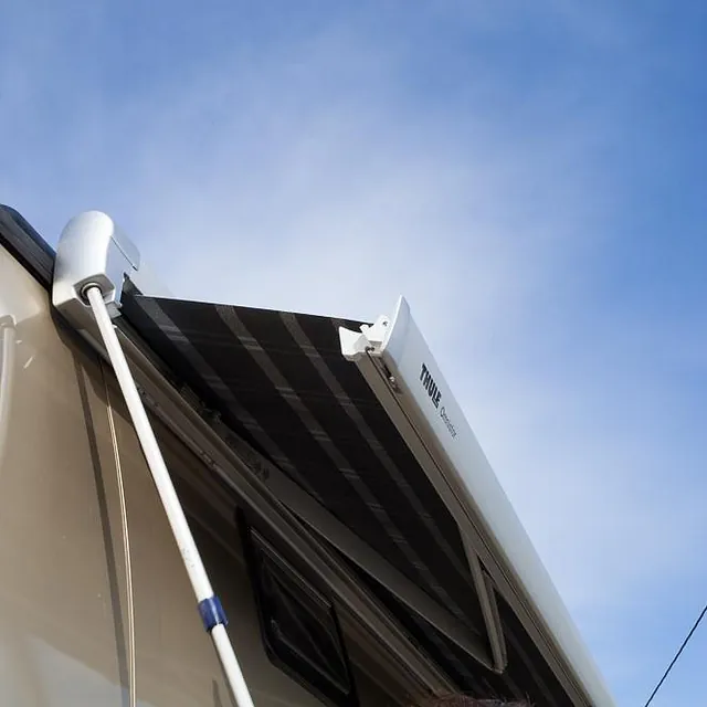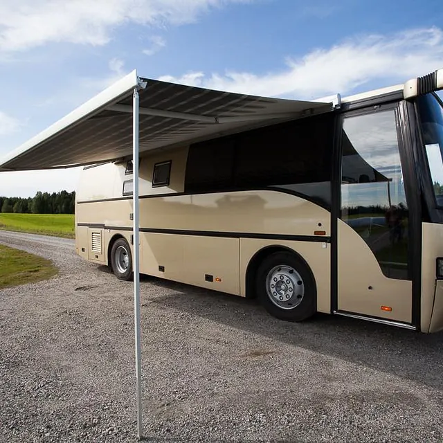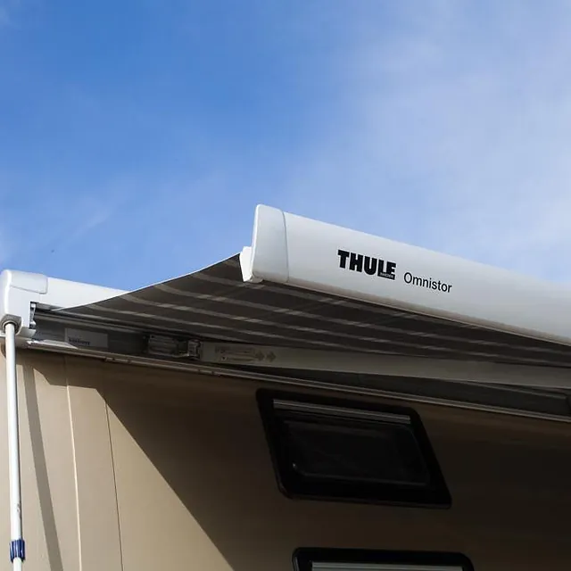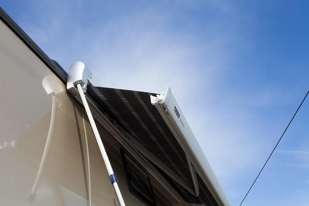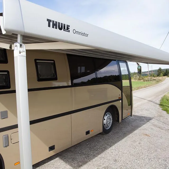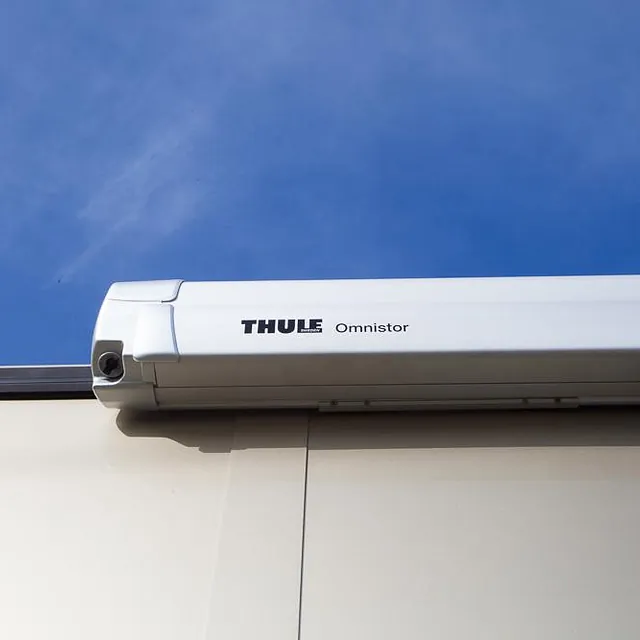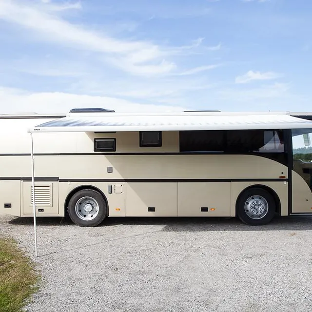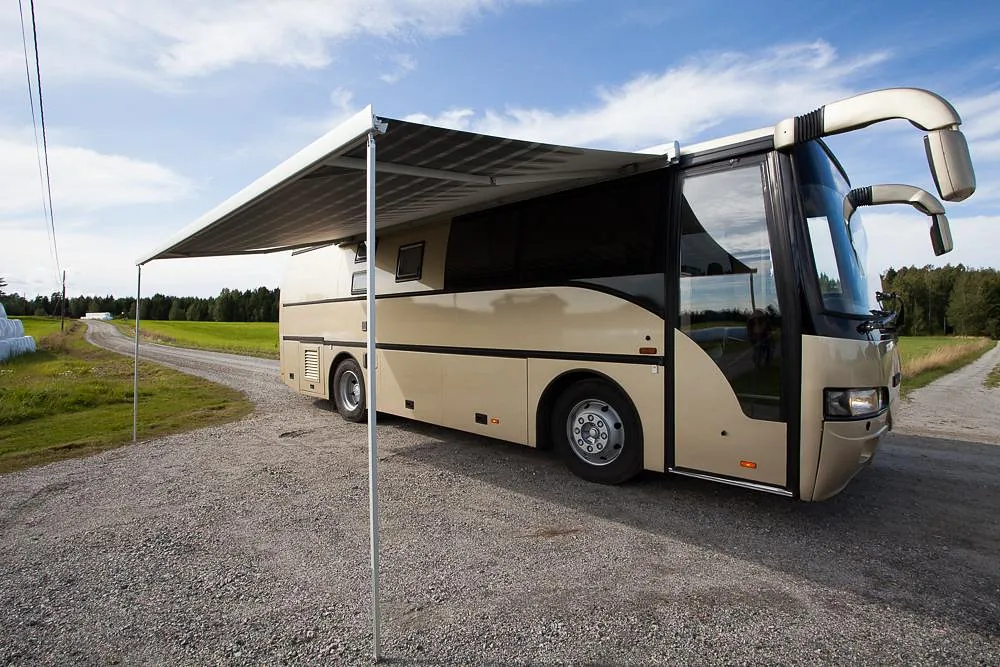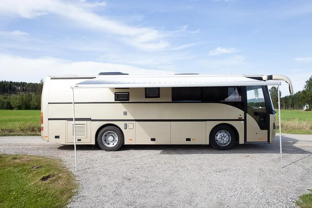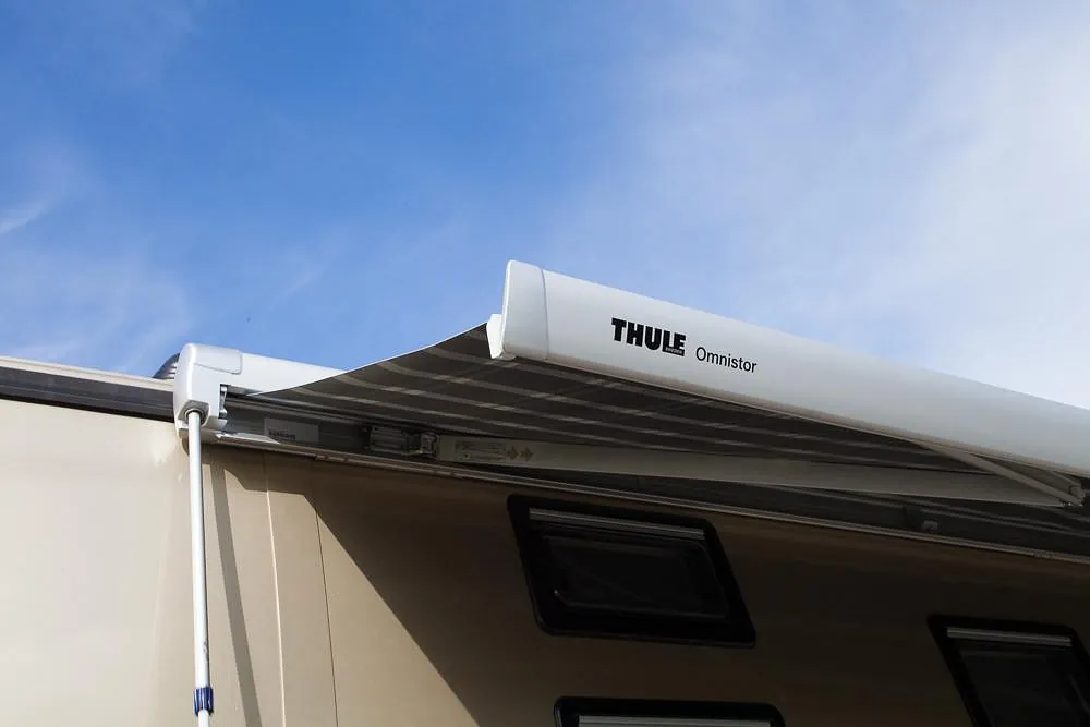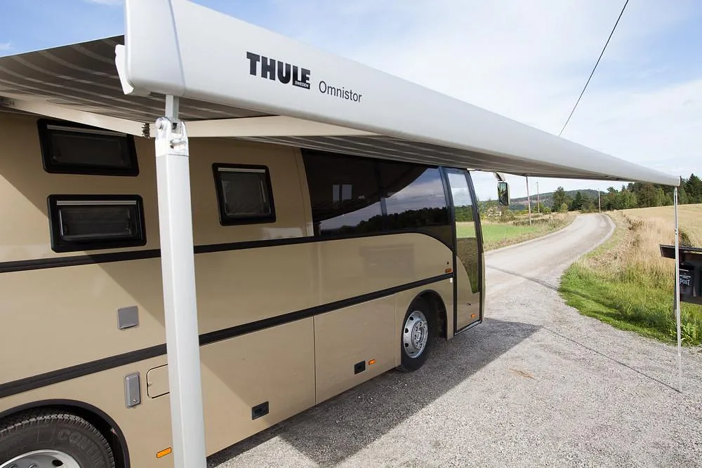 Bussen har i tillegg markedets største Omnistor markise på 6 x 3 meter, med veggpakke som gir et ekstra uterom på ca 18 m2! Her er det også montert utvendig uttak av gass til gassgrill og vannuttak til håndvask eller matlagning i teltet.