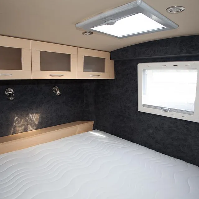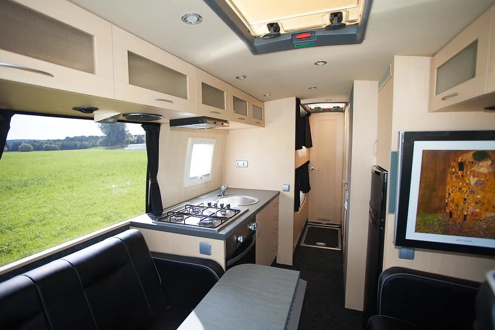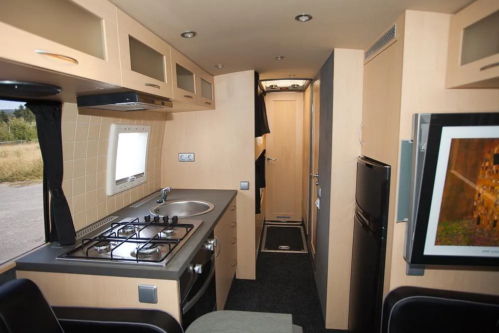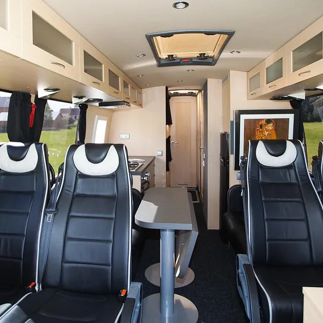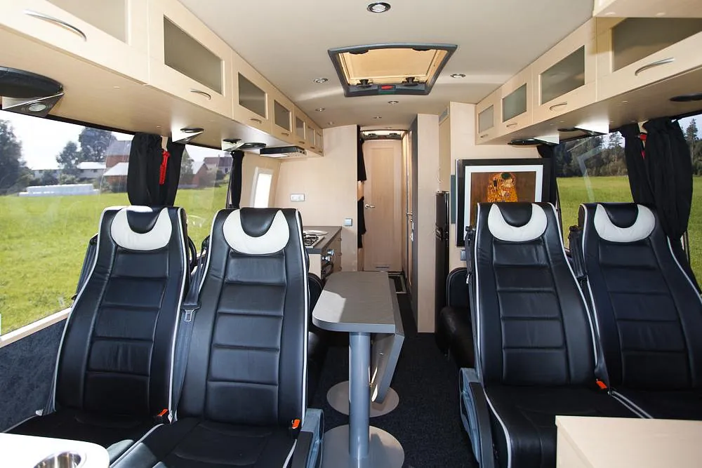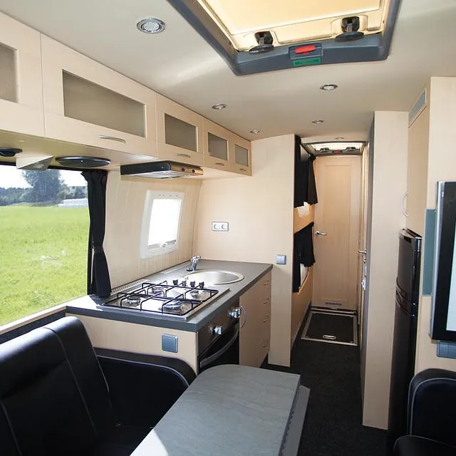 Videre er bussen hel-lakkert og har fått en komplett innredning med 4 faste liggeplasser, «lounge»/sofagruppe med nedfellbare sofaer til dobbeltseng og bord, bad med full-size dusj, keramisk toalett og vask, kjøkken med alle hvitevarer på gass og 230v, varmepumpe/AC, caravanvindu løsning og ellers alt nødvendig utstyr!