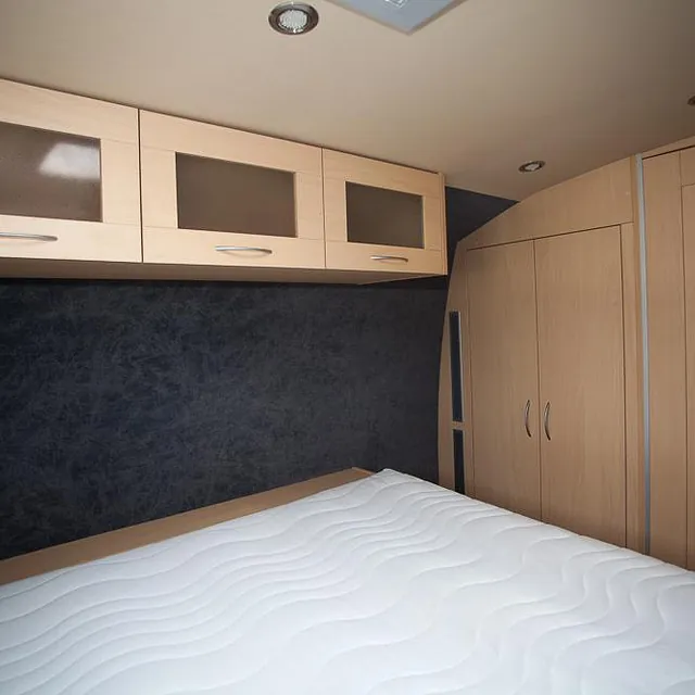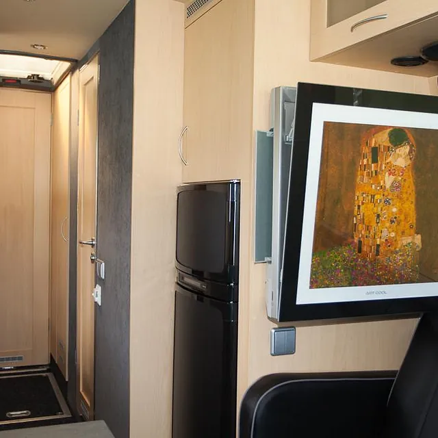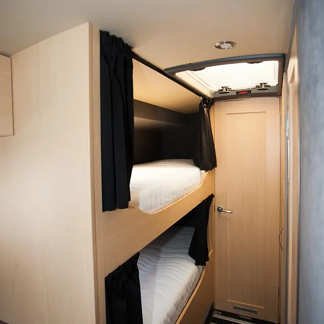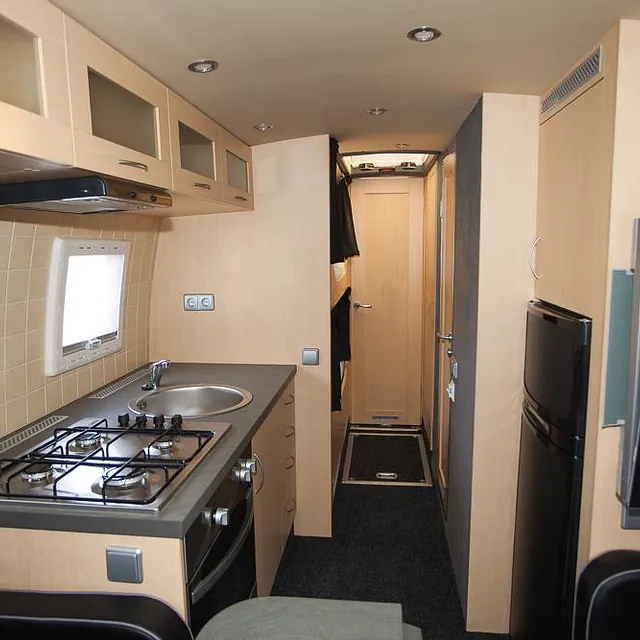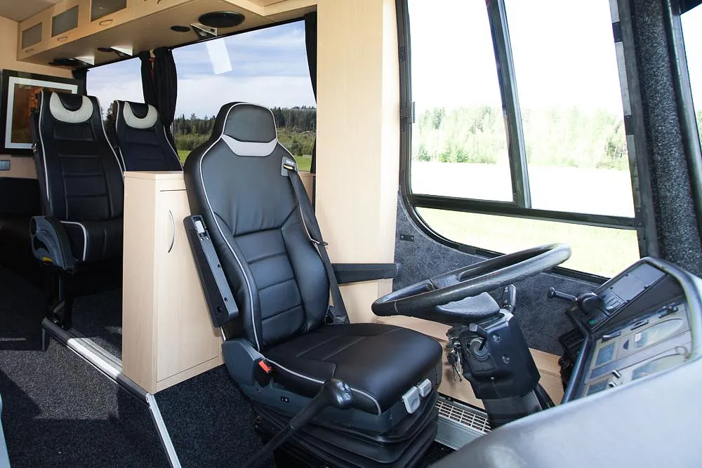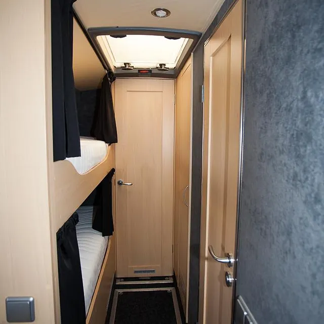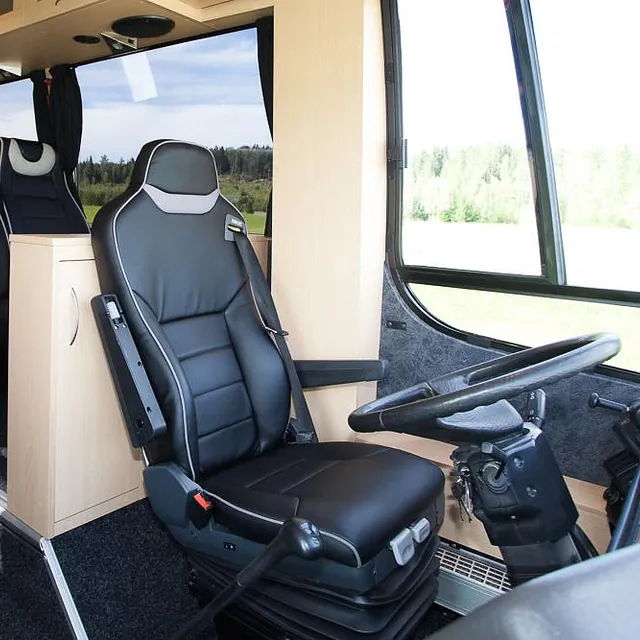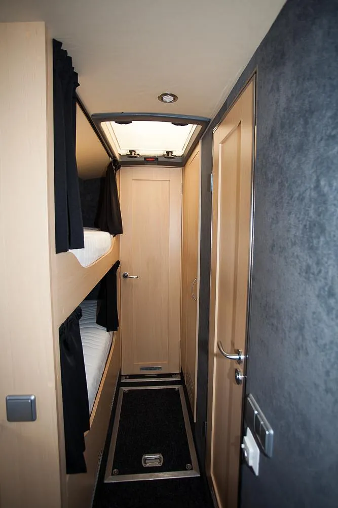 Videre er bussen hel-lakkert og har fått en komplett innredning med 4 faste liggeplasser, «lounge»/sofagruppe med nedfellbare sofaer til dobbeltseng og bord, bad med full-size dusj, keramisk toalett og vask, kjøkken med alle hvitevarer på gass og 230v, varmepumpe/AC, caravanvindu løsning og ellers alt nødvendig utstyr!