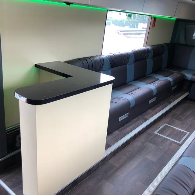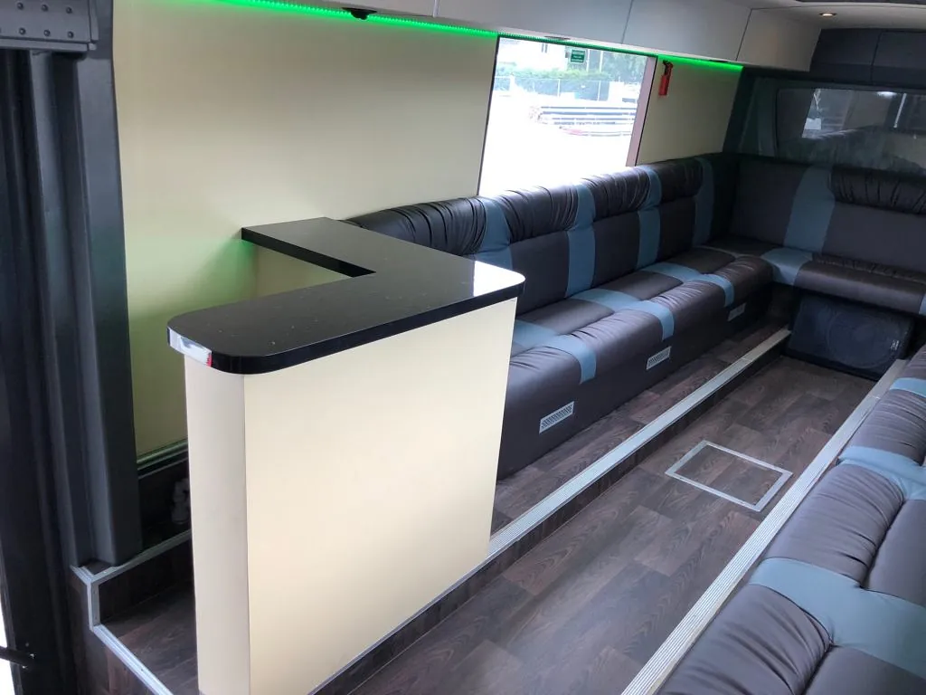 Innredet med bla tofarget interiør, plassbygget bar, LED lys mm.