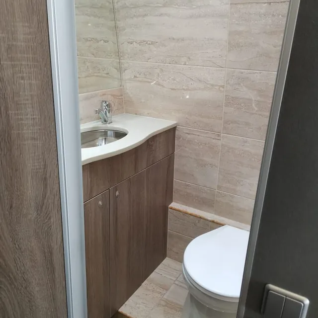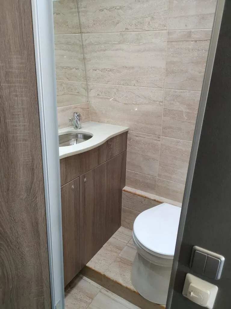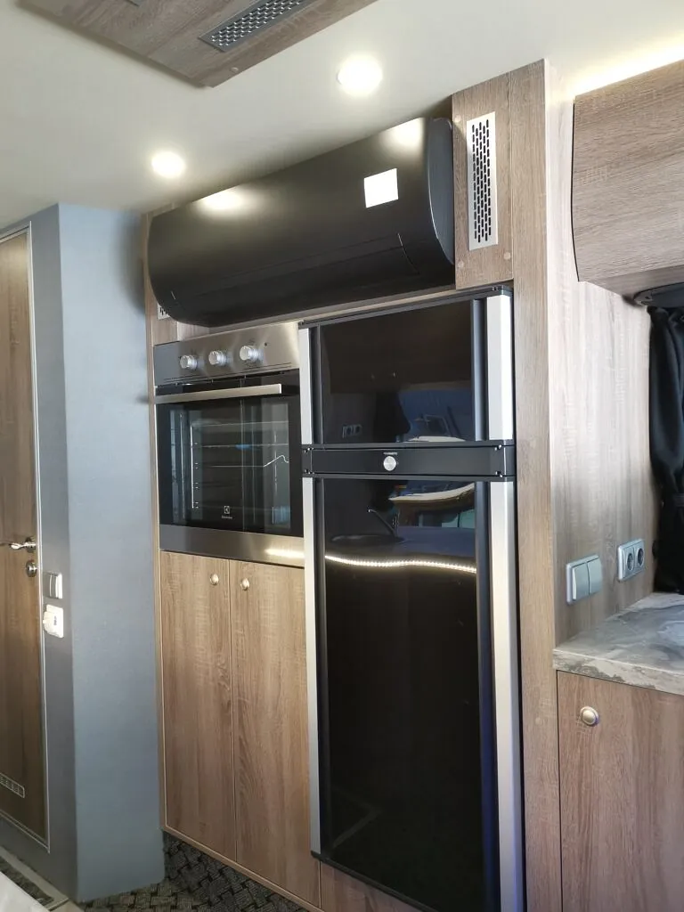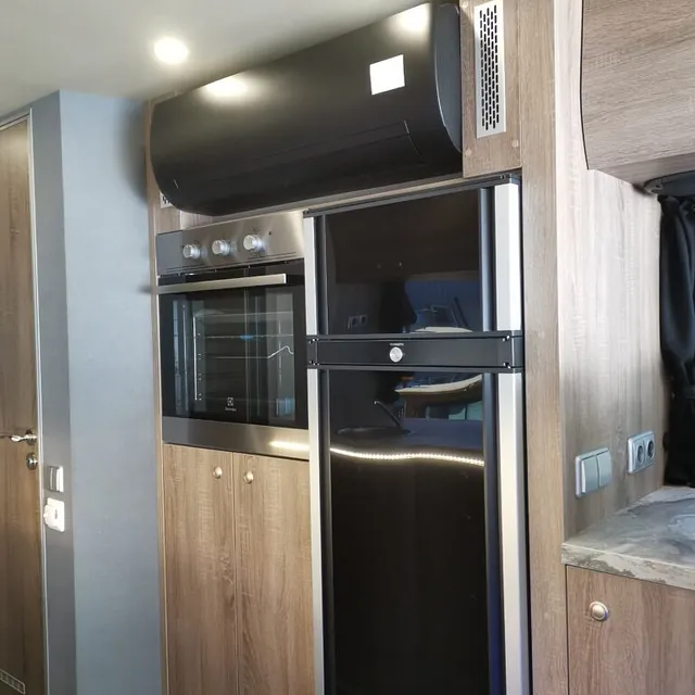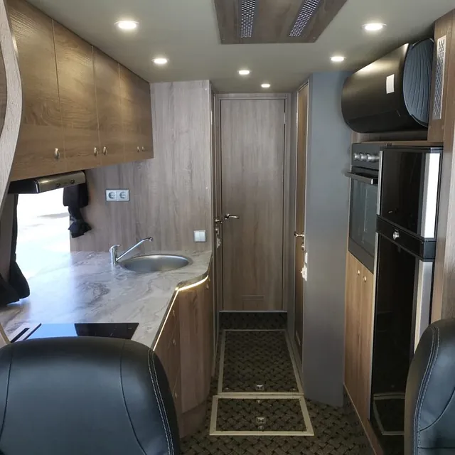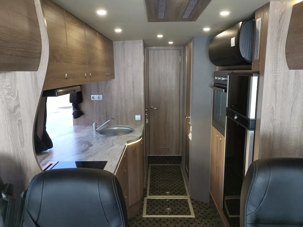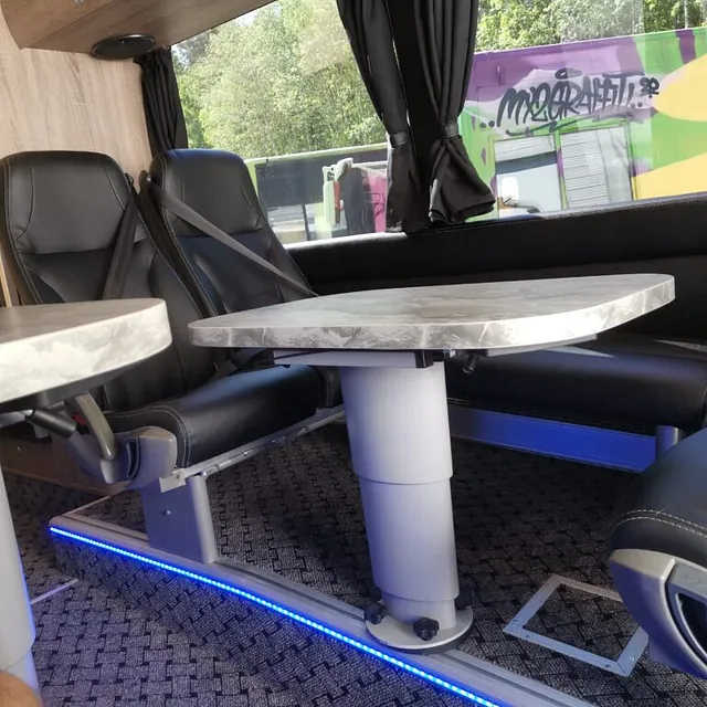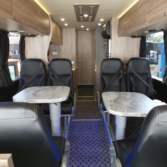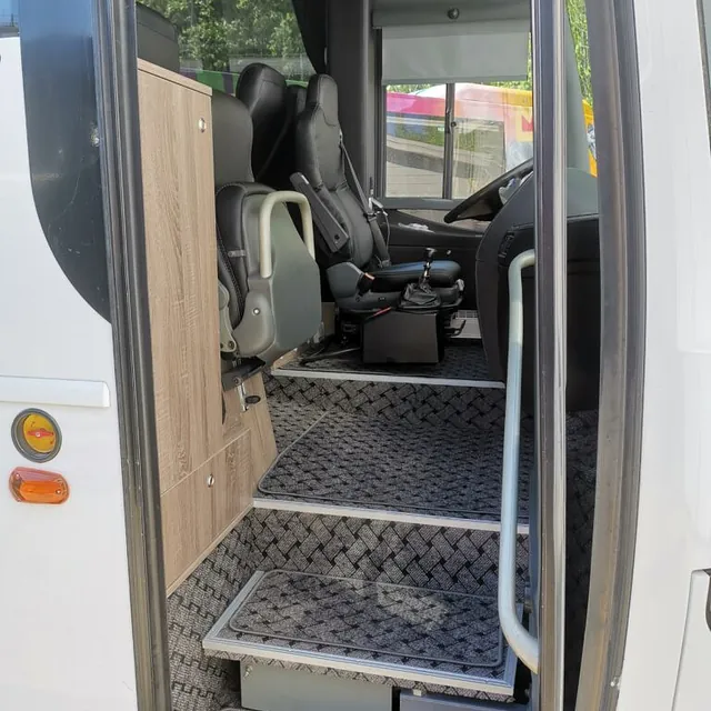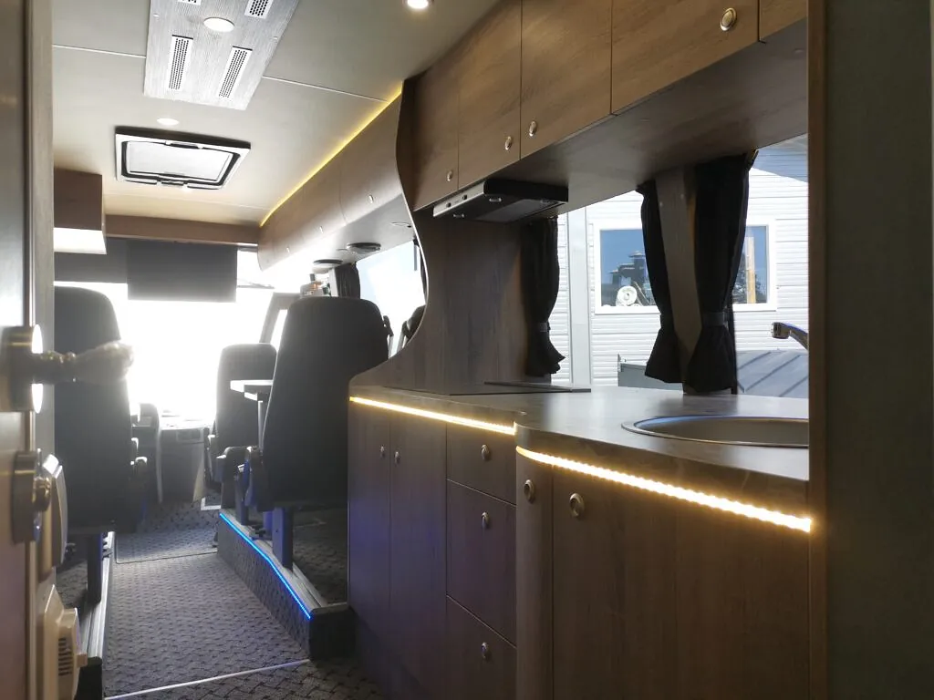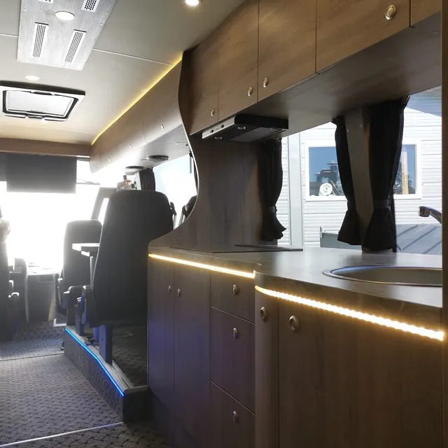 Kombibuss med langt skappåbygg, fullinnredet campingbuss.