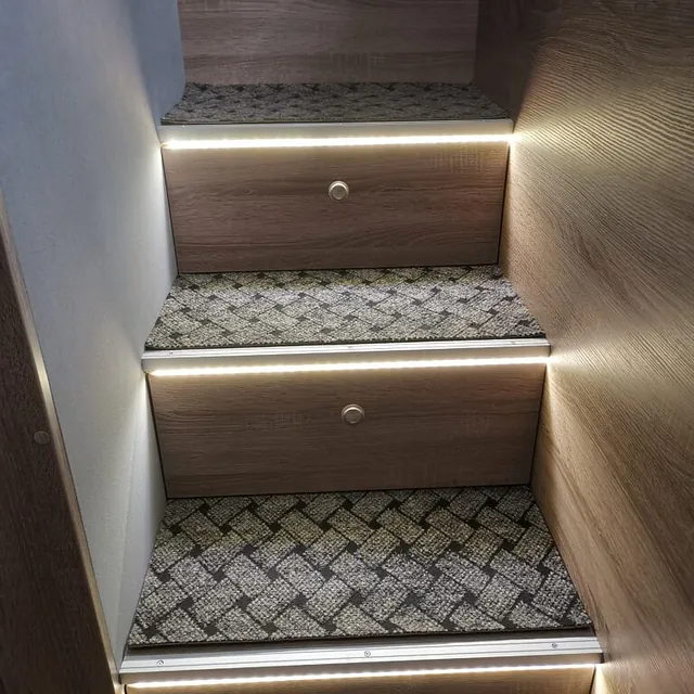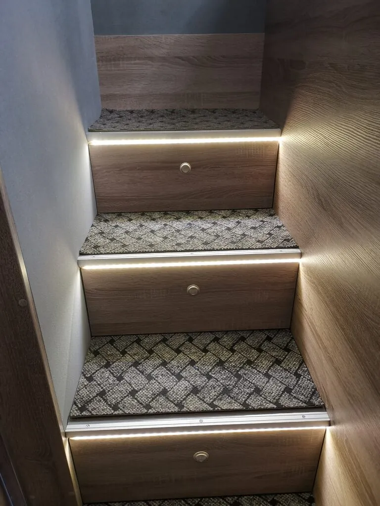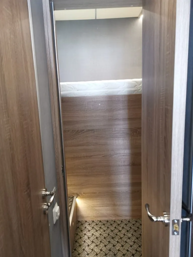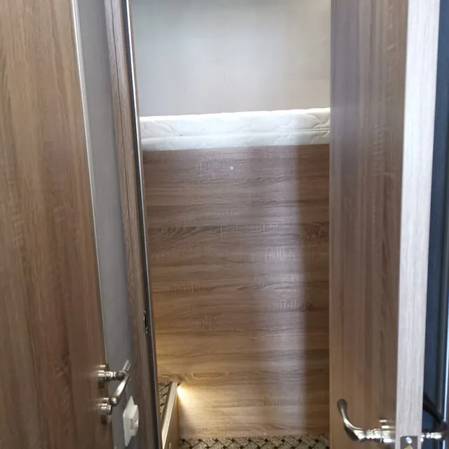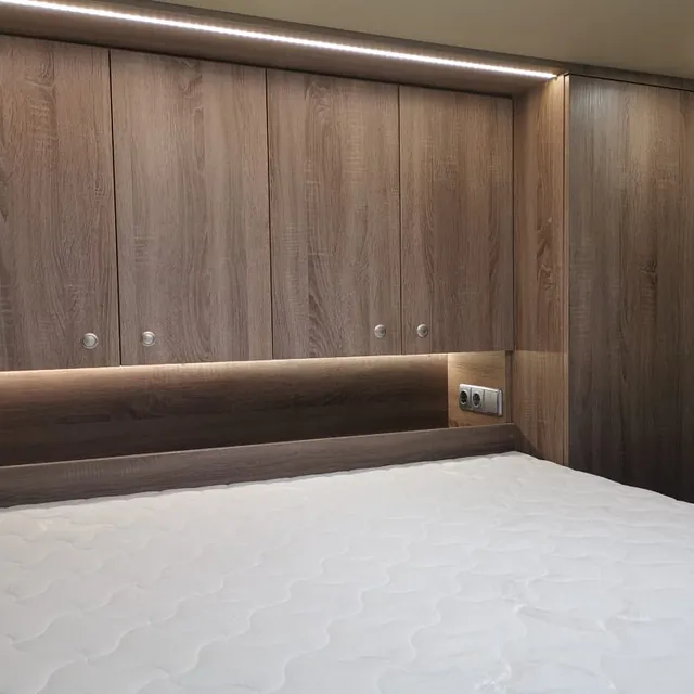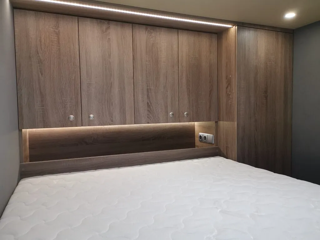 Vi åpnet opp veggen inn til skapet og laget et forhøyet soverom, med plass fra lasterommet under sengen, så innlasting av f. eks en lang bil ikke skal by på noen problemer.