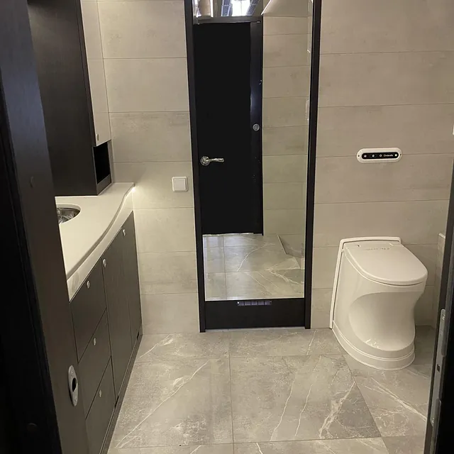 - Gjennomgående bad m/ Cinderella forbrenningstoalett, stort dusjhjørne, innredning med 2 vasker.
